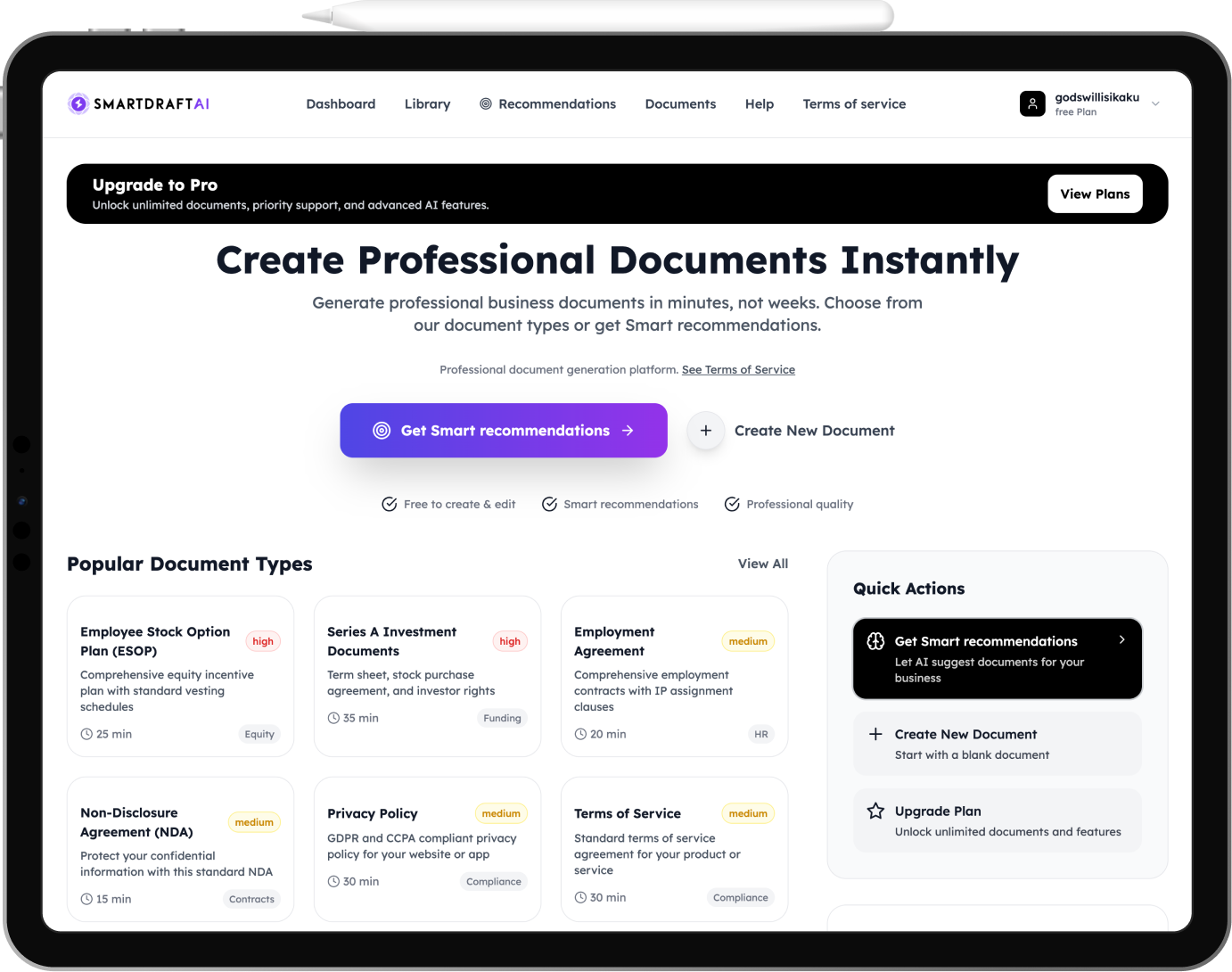 Join thousands of founders who've chosen SmartDraft AI to handle their document creation. Start creating professional, customized documents in minutes, not months.